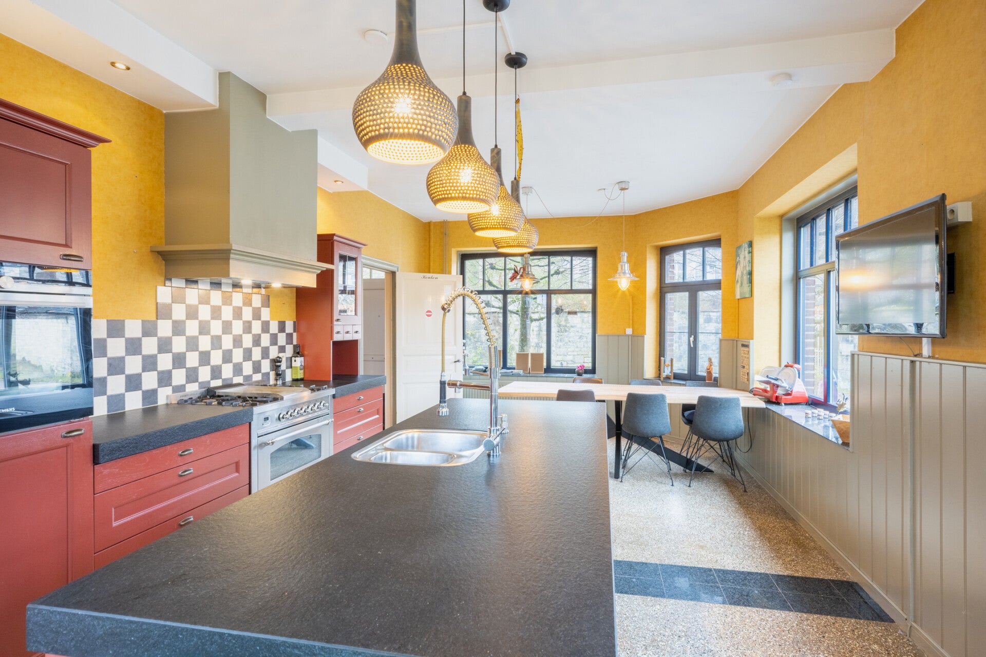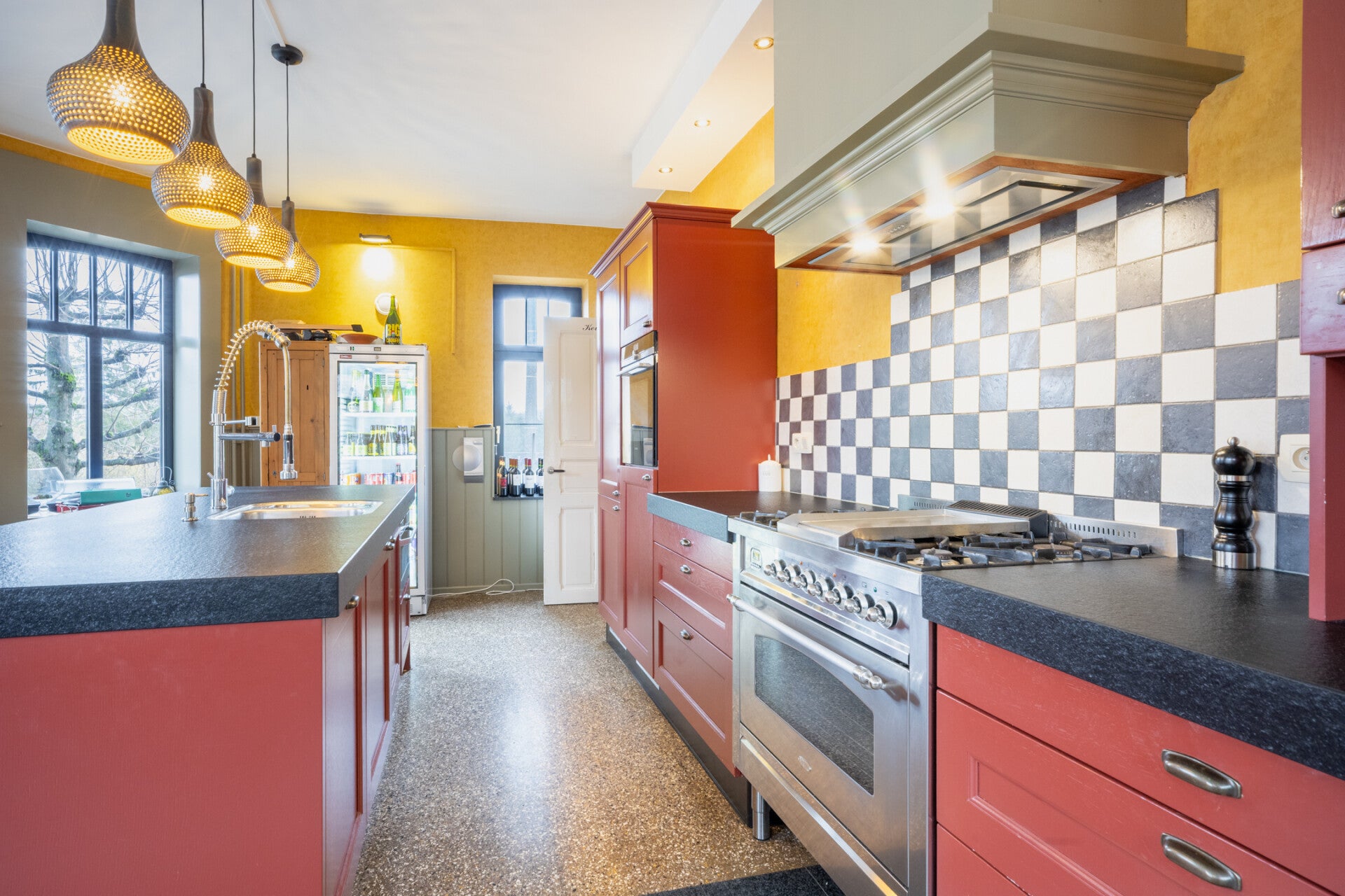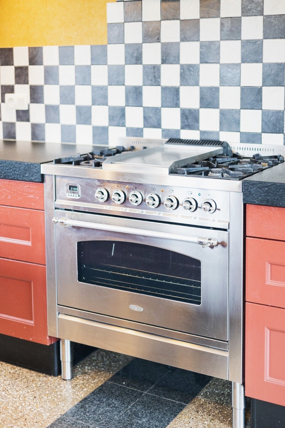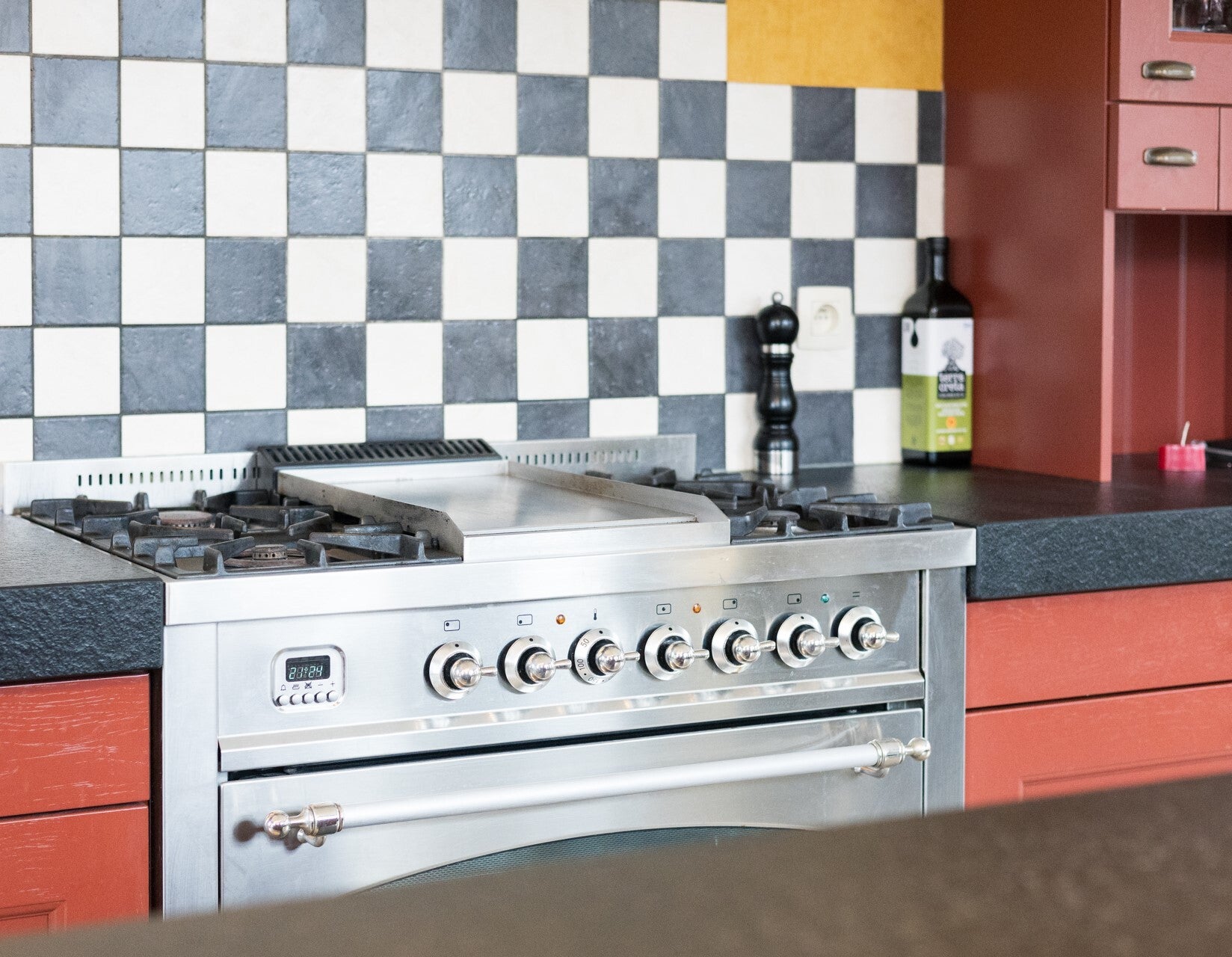 Cuisinière au gaz avec plancha au milieu; Four au gaz, un 2ième four électrique taille standard, un 3ième mini-four/grill, micro-onde, lave-vaisselle, frigo, surgélateur, air fryer, nombreux ustensiles de cuisine, appareil à raclette, ...